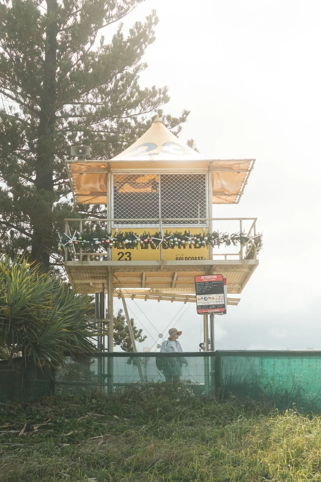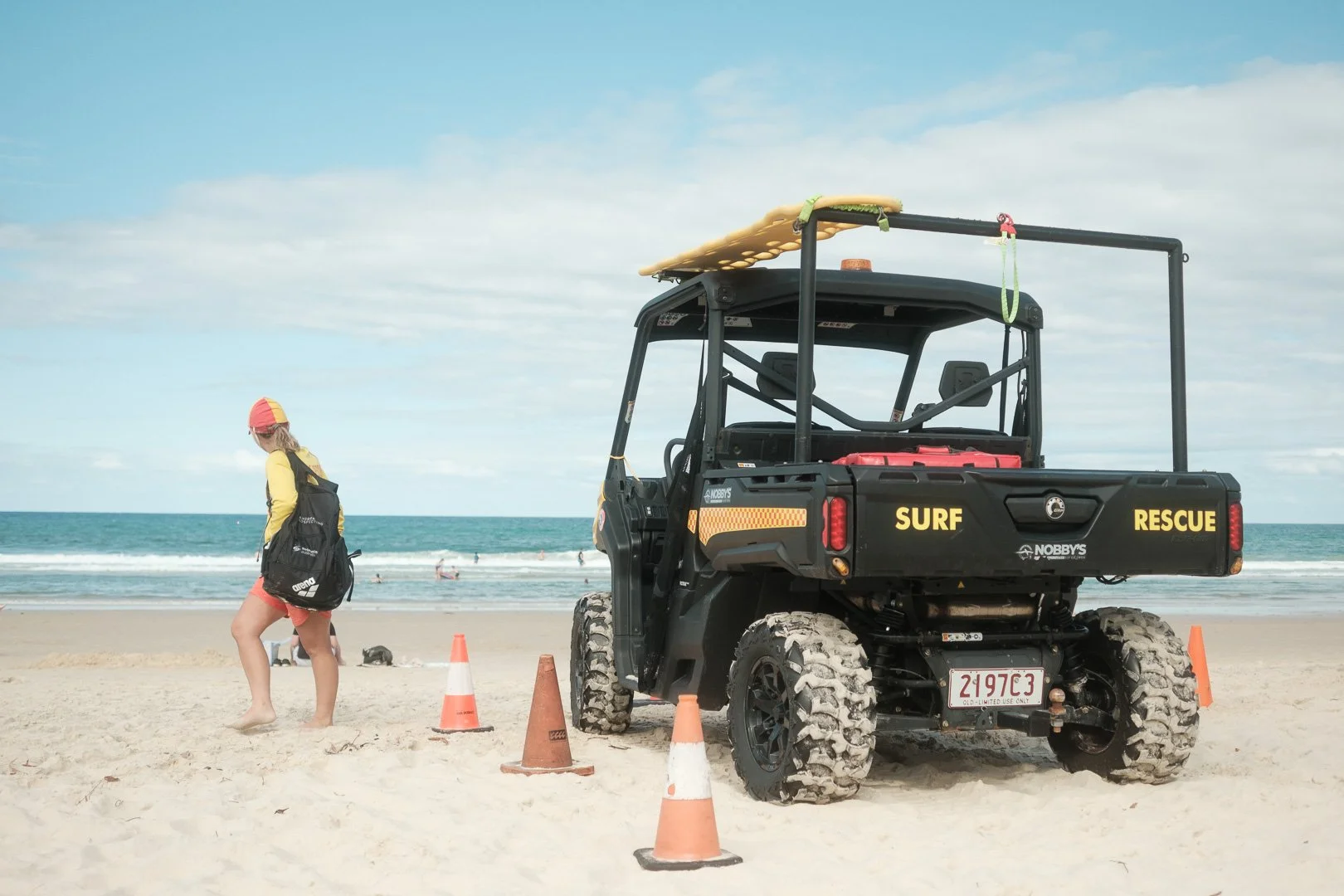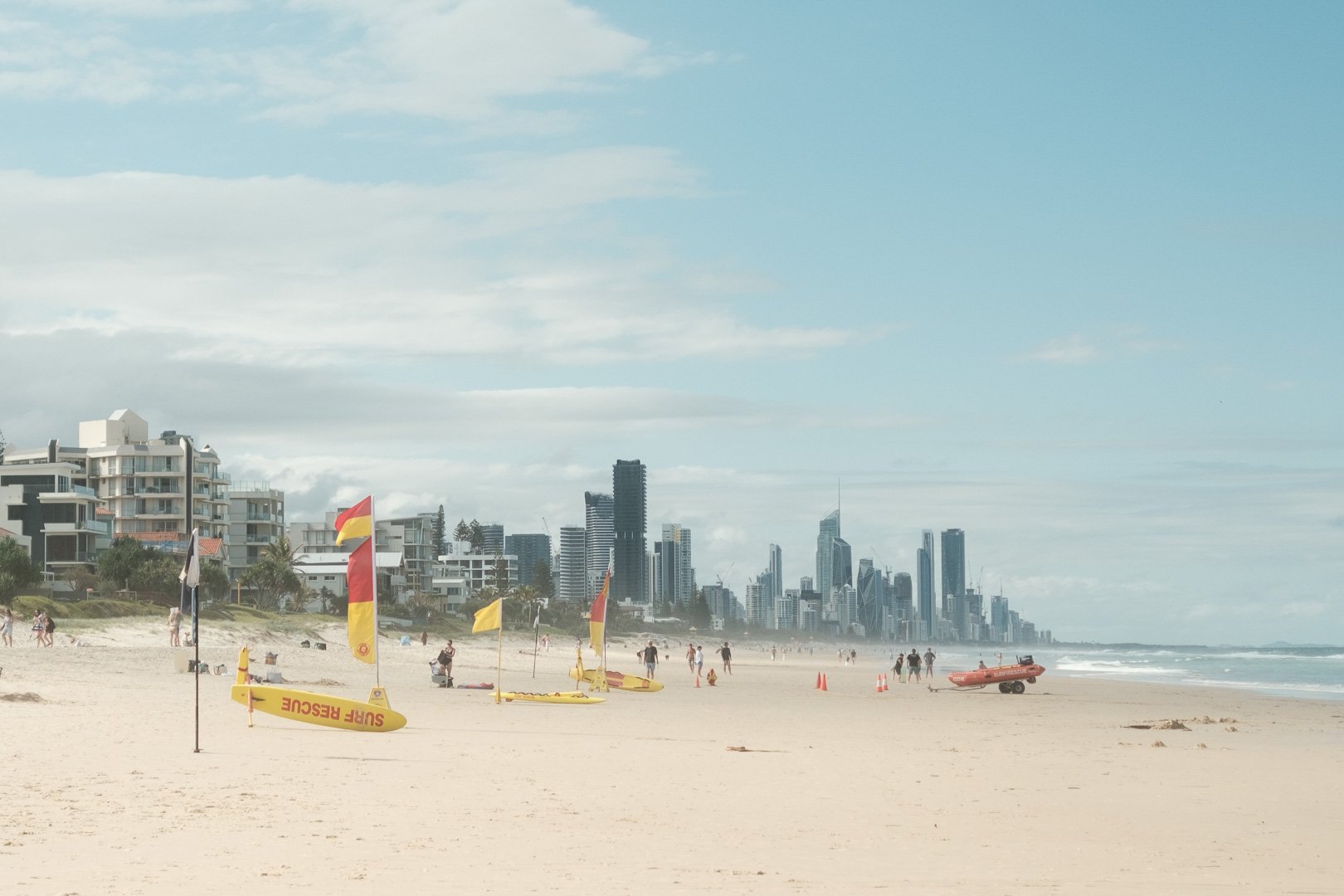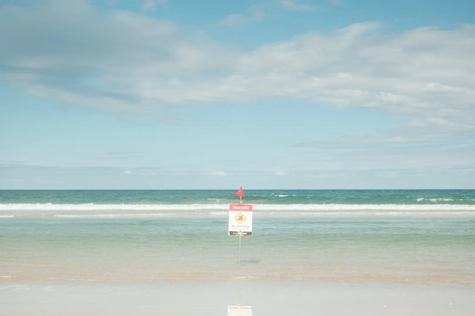Flags. Cones. Signs. The visual shorthand that tells you "beach" without needing a sweeping vista.