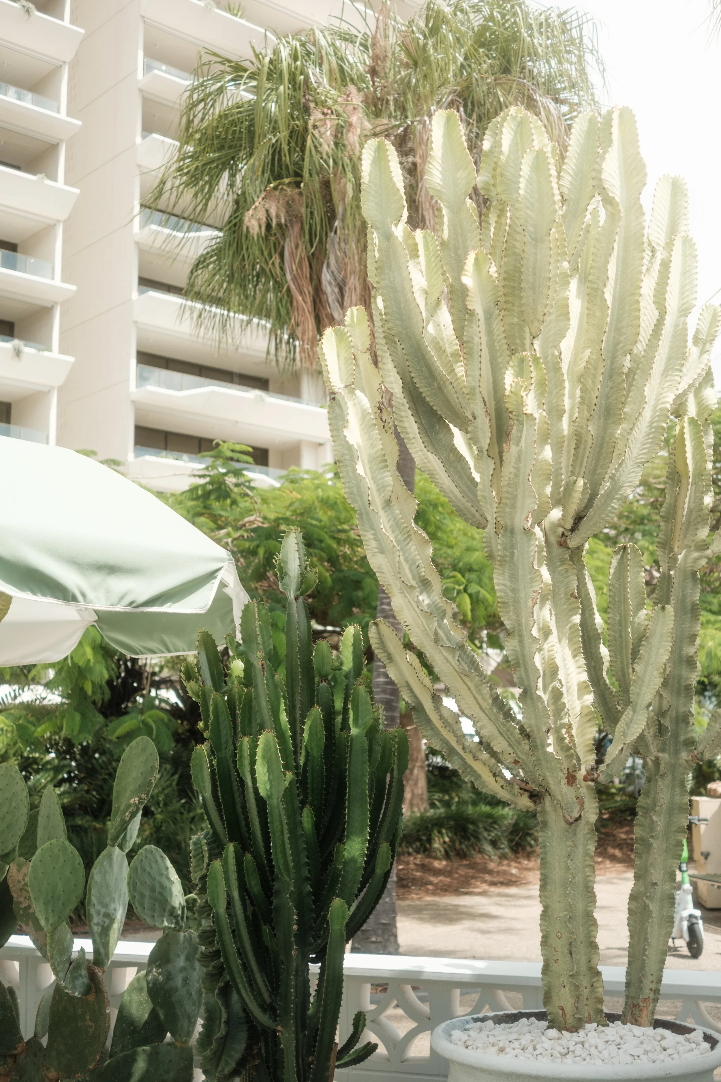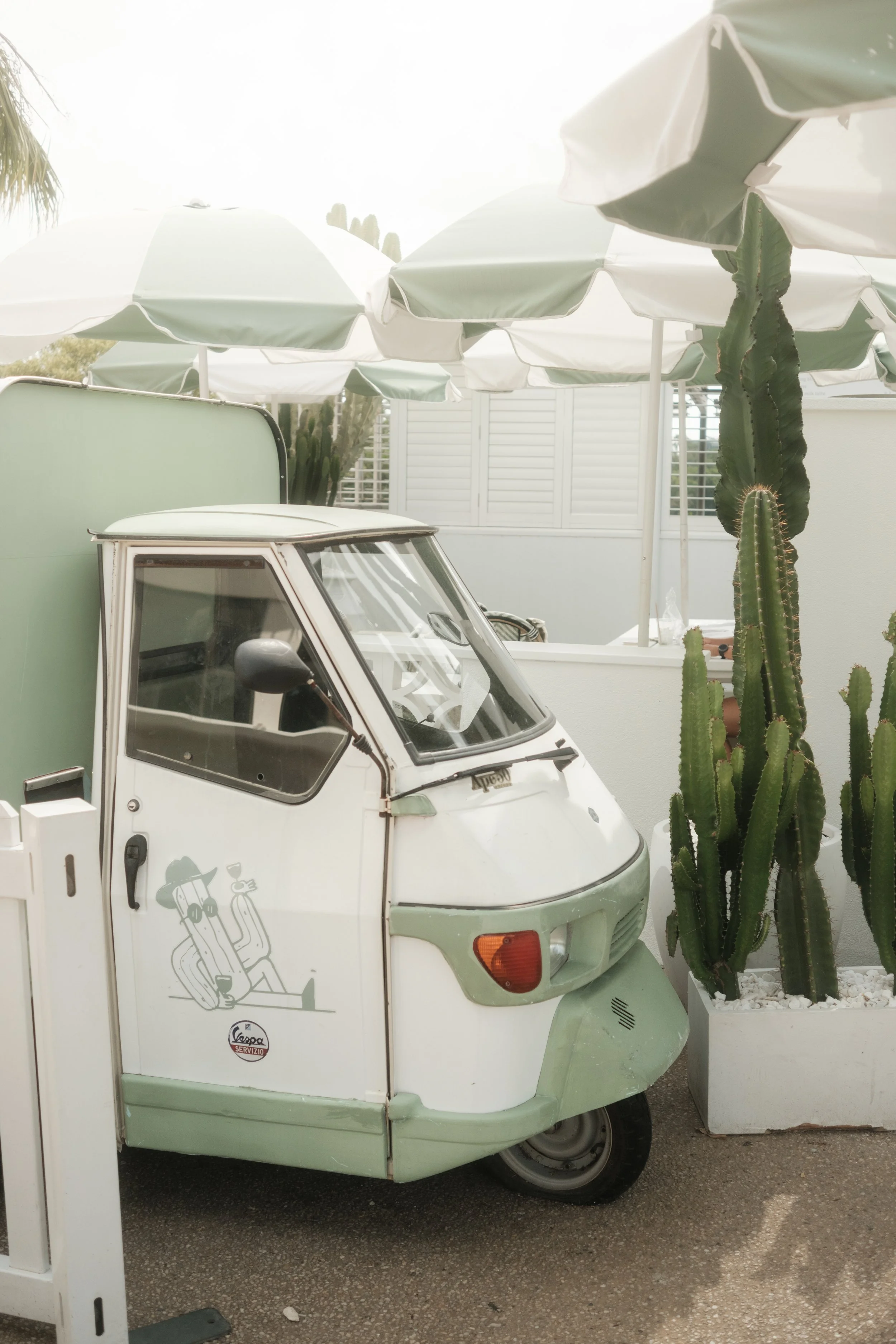 Mint green umbrellas everywhere. White furniture. Cacti throwing these perfect little shadows. The whole colour palette was doing the work for me.