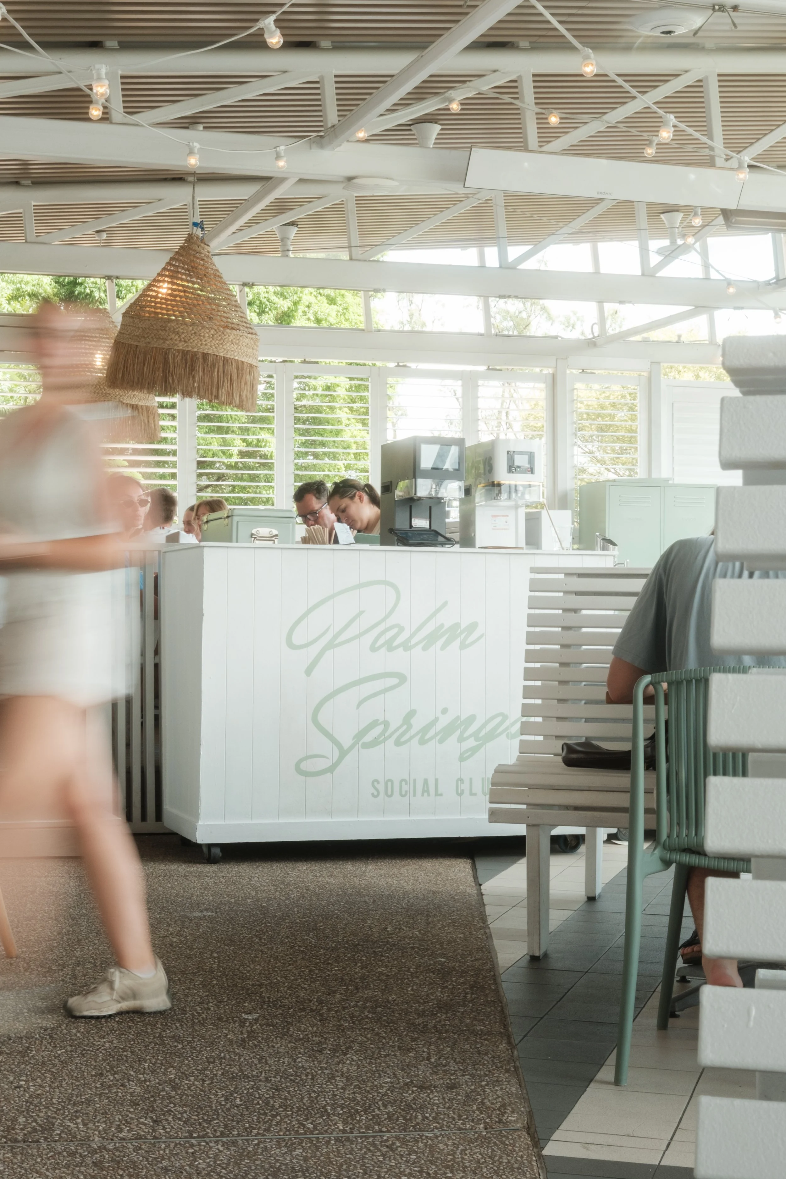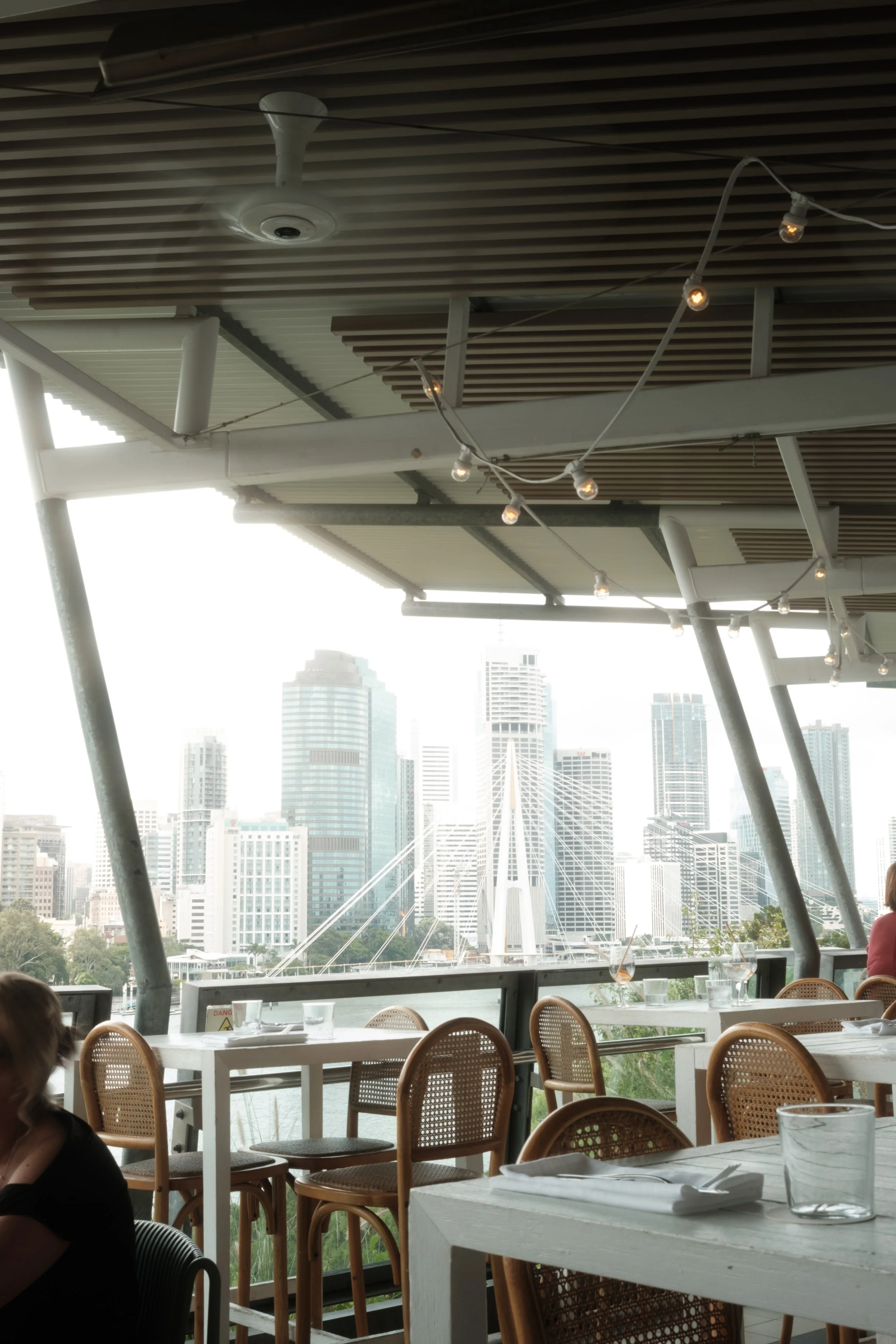 The mint umbrellas aren't just decoration—they're the whole colour story. The haze isn't a flaw to fix in post—it's what makes Brisbane summer feel like Brisbane summer.