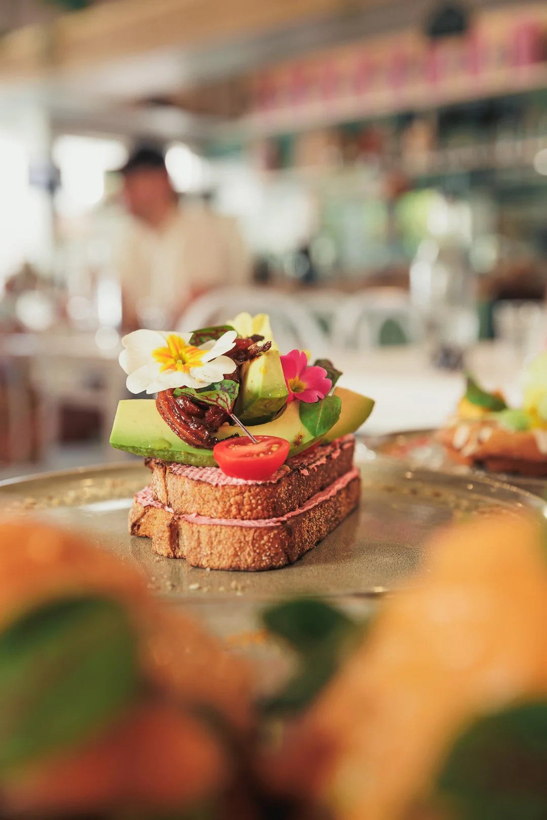 Open-faced sandwich with avocado, cherry tomato, edible flowers, and greens on toasted bread, on a silver platter in a bright restaurant setting.