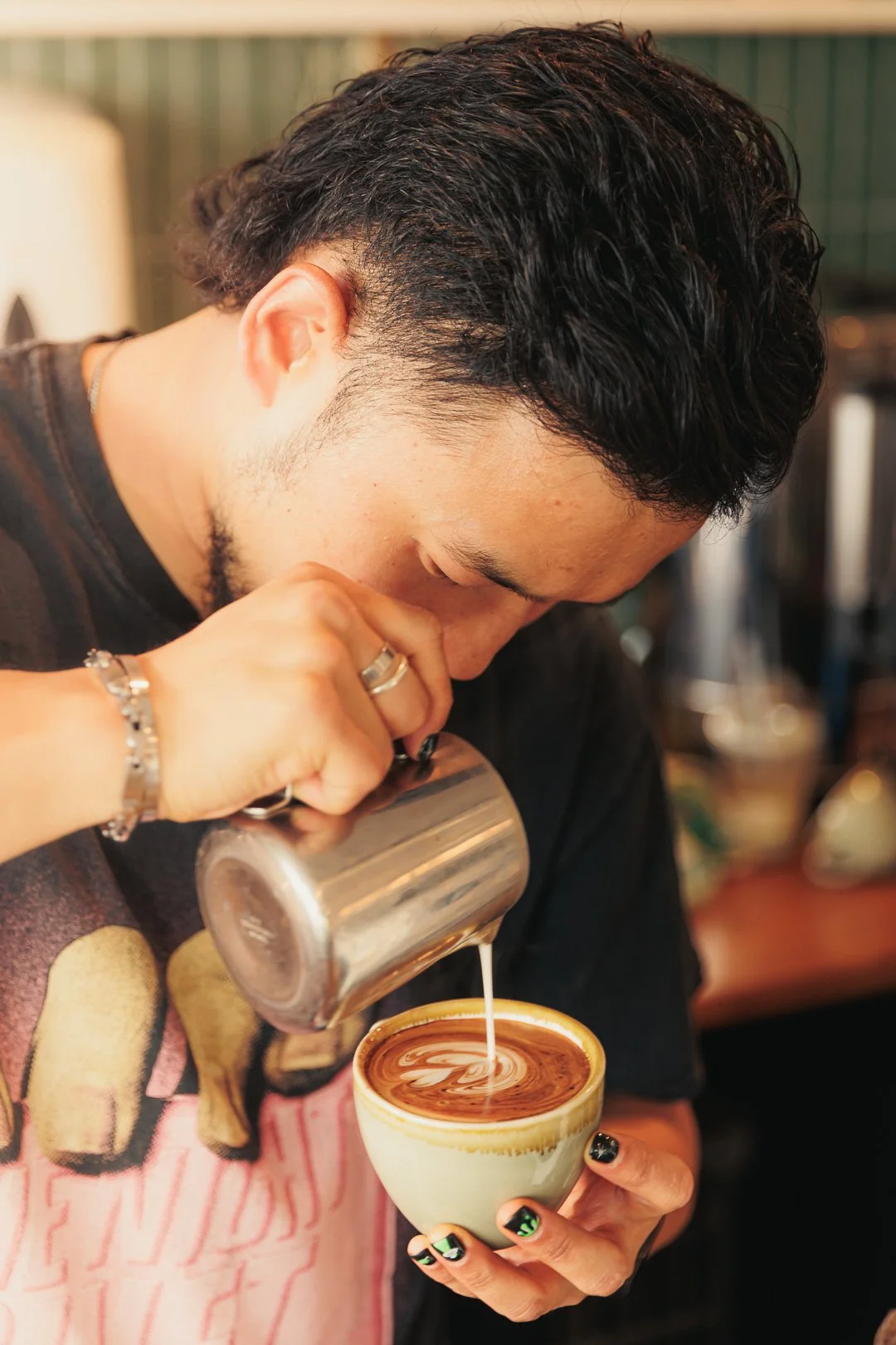 A person with dark hair pouring milk into a cup of latte, creating latte art. View fullsize