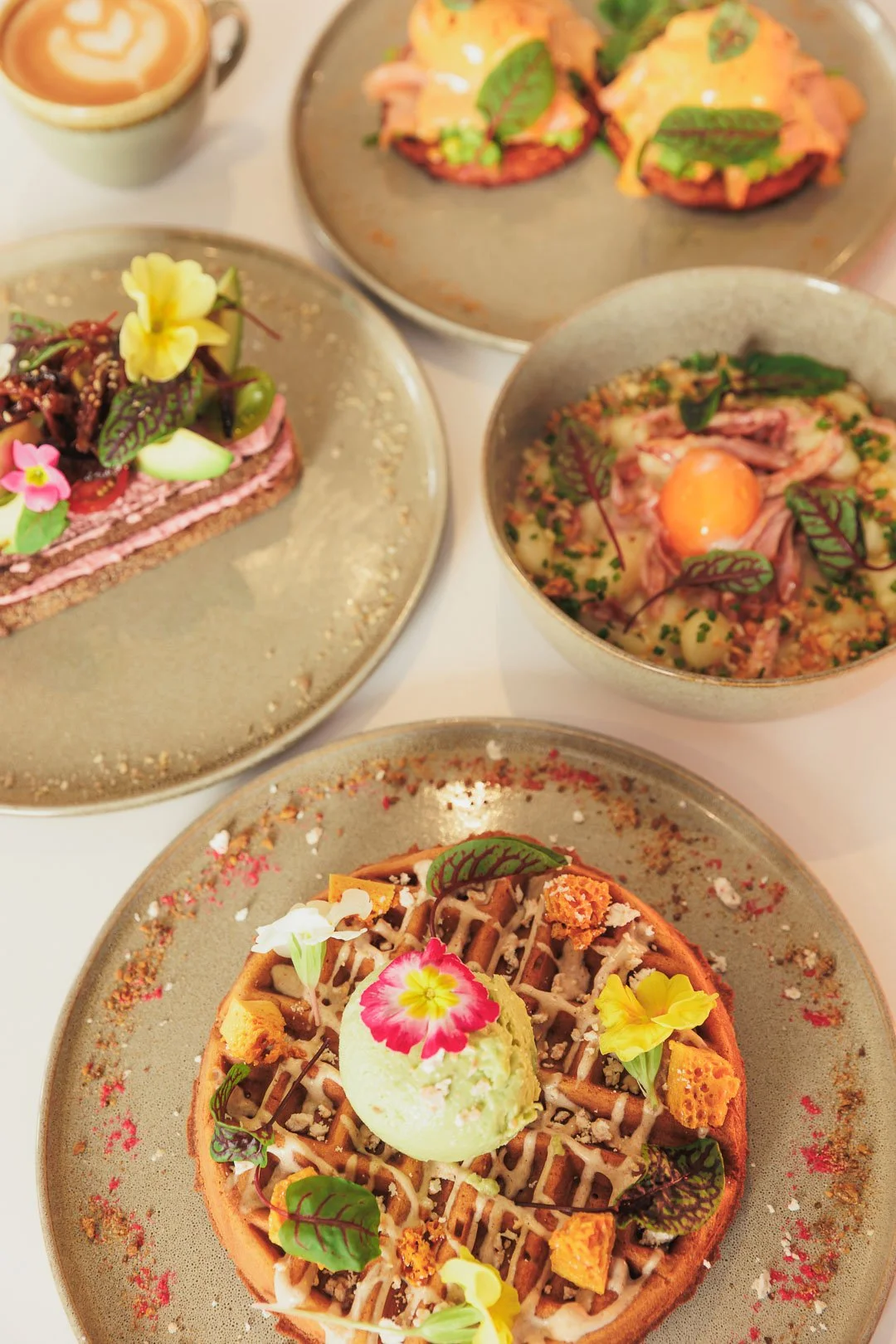 Dessert waffles topped with ice cream, edible flowers, and garnishes, and dishes with savory ingredients, all on beige plates.